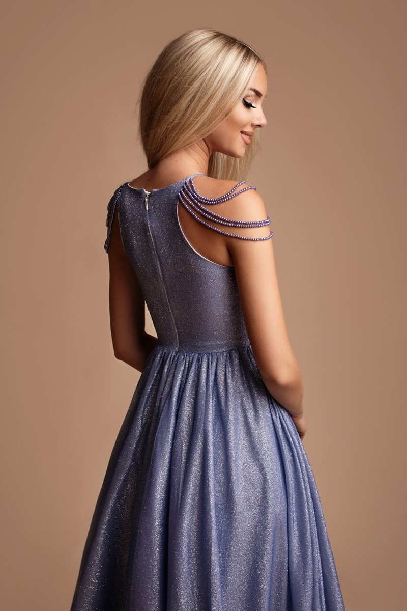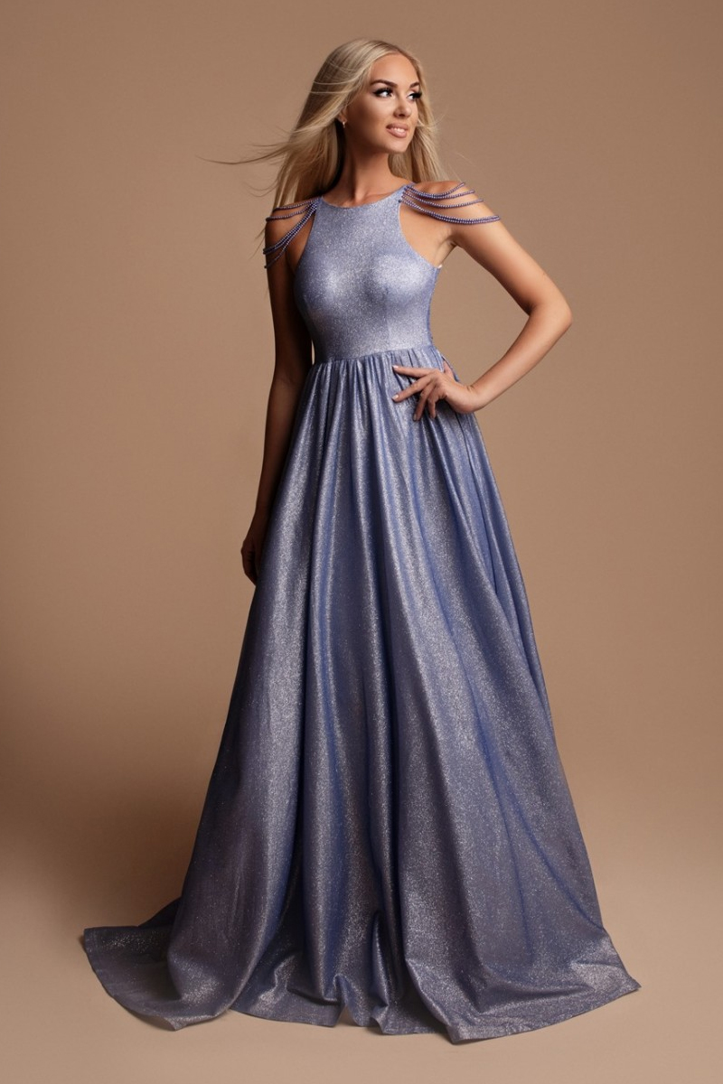 Jedinečný trblietavý plesový model s bohatou sukňou a perličkovými ramienkami.
